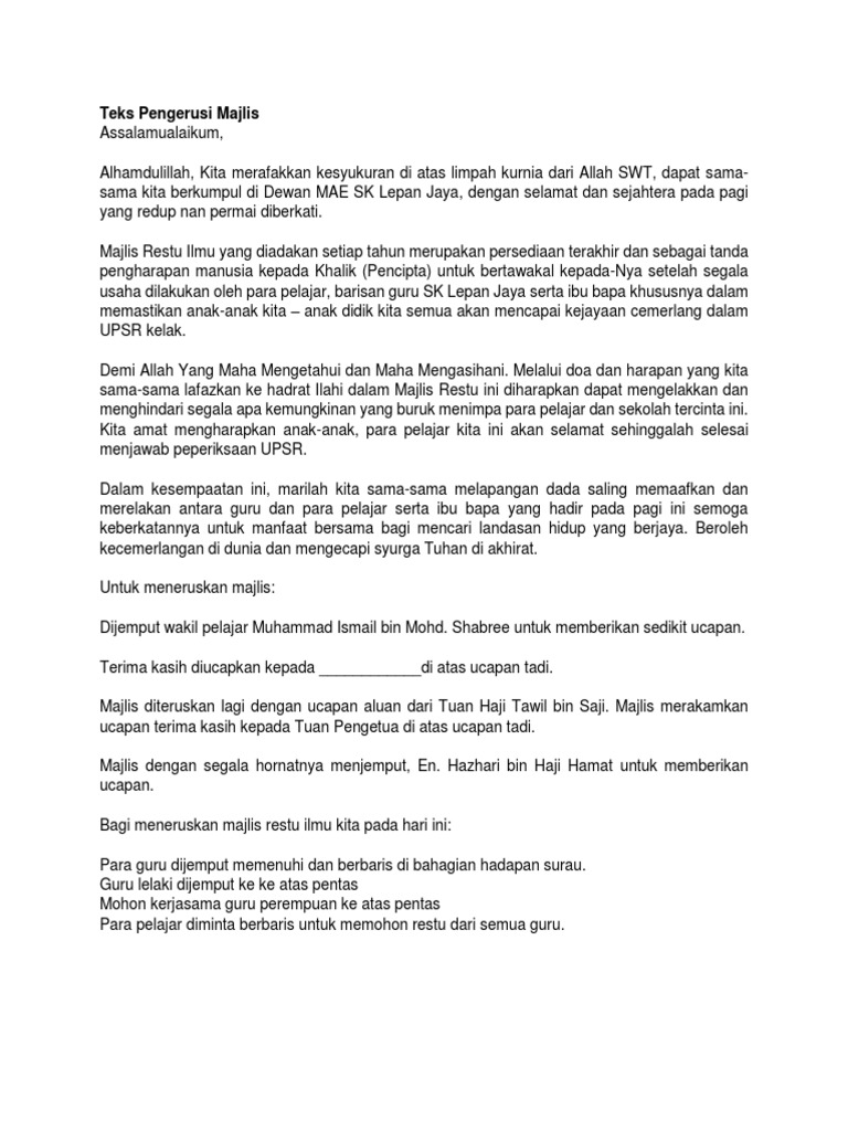 Majlis bacaan ikrar pelajar upsr yang diketuai oleh ketua murid adik yusri iskandar 6t diikuti oleh semua murid tahun 6 2016. Majlis restu ilmu 2018 21 september 2018 jumaat telah diadakan majlis restu ilmu untuk murid murid tahun 6 yang bakal menduduki upsr pada minggu hadapan 24 september 27 september 2018. Majlis restu ilmu upsr 2017 7 september 2017 khamis tempat dewan sk. Teks pengacara majlis restu ilmu 2014 mencari timba si anak dara dibawah sarang burung tempua salam sembah pembuka bicara sela.