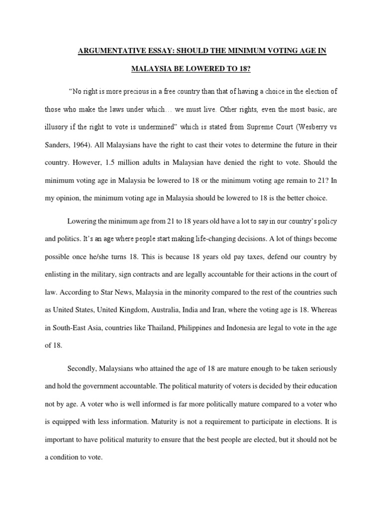Argumentative Essay Should The Minimum Voting Age In Malaysia Be Lowered To 18 Docx Should The Minimum Voting Age In Malaysia Be Lowered To 18 No Course Hero