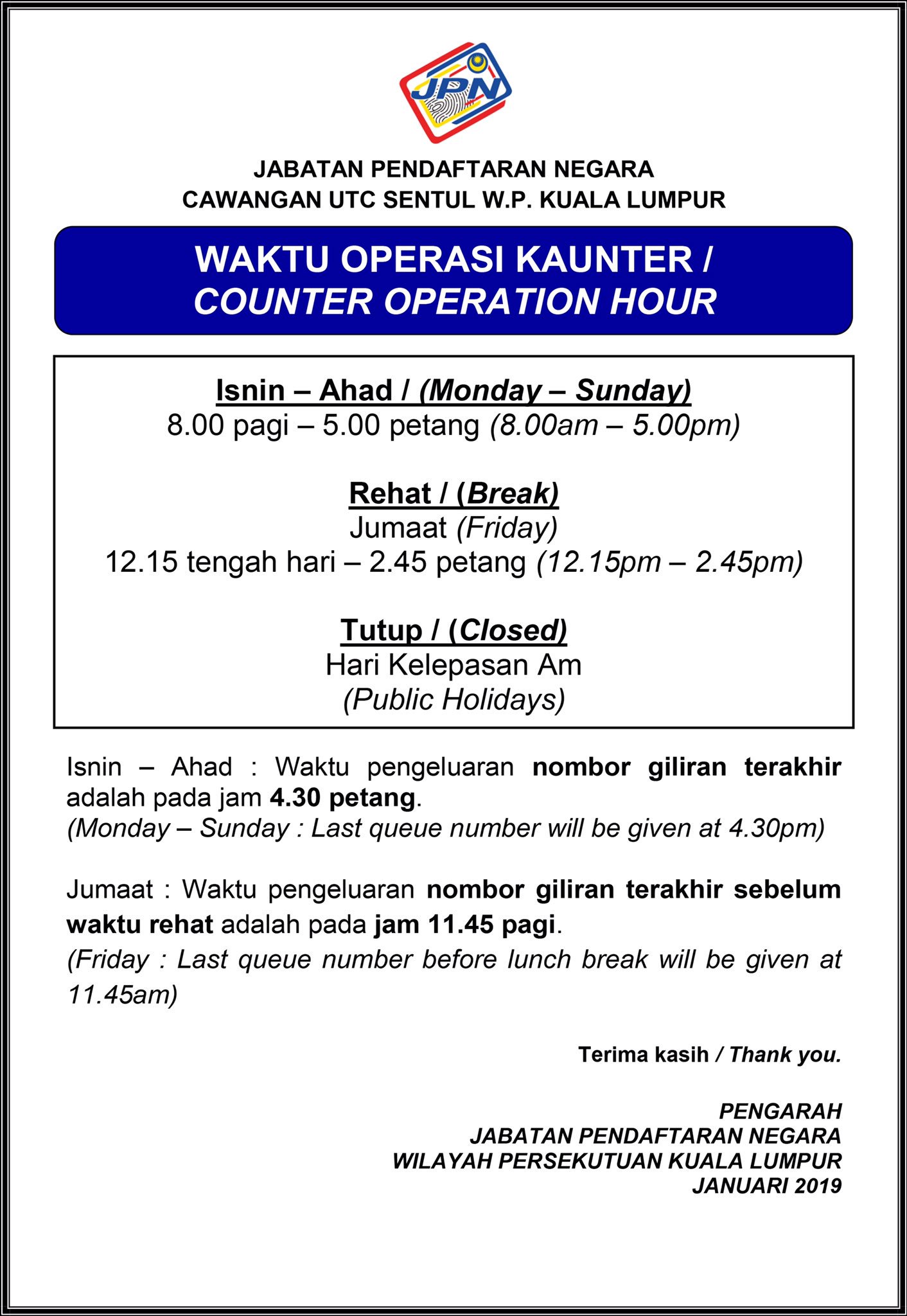 Jpn Wilayah Persekutuan Kuala Lumpur On Twitter Notis Pemakluman Pertukaran Waktu Operasi Kaunter Pejabat Jpn Wpkl Cawangan Utc Jpnm Official Kpjpnm Jasrikasim Erisjemadi Jpnwpkl Rakyatdihatijpn Perkhidmatanmerentasimasa Jpnhebat Https T