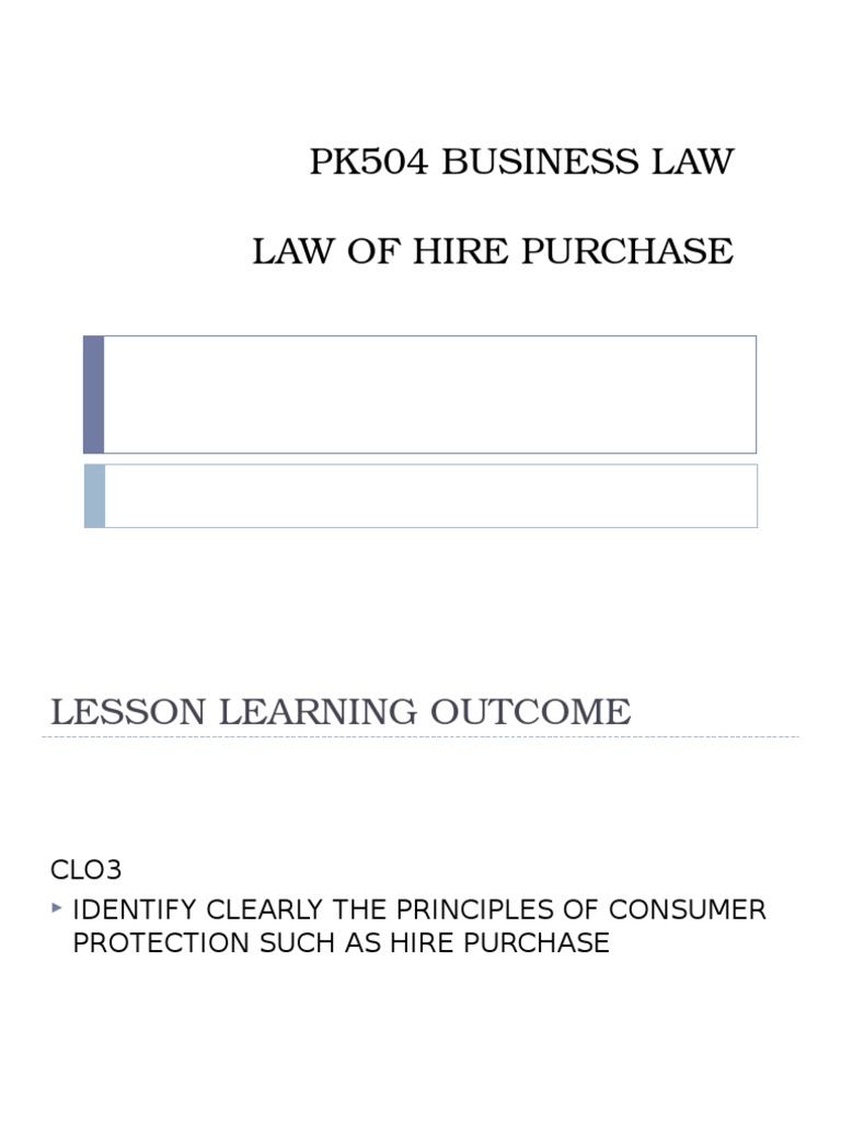 What is hire purchase in business law. The hirer is given an option to purchase at the end of the duration of hire. Hire purchase is a method of financing of the fixed asset to be purchased on future date. The hire purchase agreement needs to be in writing and signed by all parties involved in the agreement. Hire purchase agreements are agreements whereby an owner of goods allows a person the hirer to hire goods from him for a period of time by paying installments.