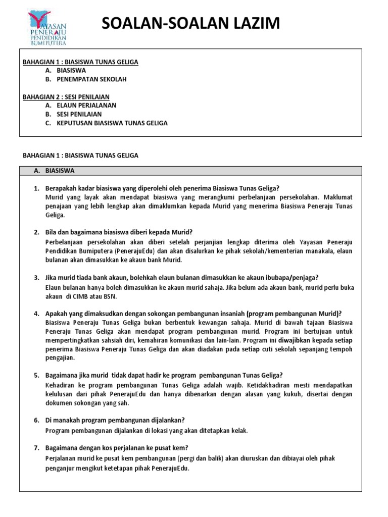 Soalan Soalan Lazim Peneraju Tunas Geliga Peneraju Untuk Memberi Peluang Kepada Murid Bumiputera Lepasan Upsr Program Peneraju Tunas Geliga Permohonan Selepas Tarikh Tutup Pdf Document
